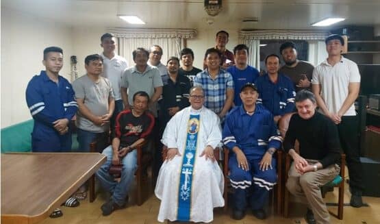 October 2024 - The Captain of the AFRICA SWIFT requested a Mass onboard. Our chaplains, working with Father Glenn of St Patrick's Cathedral, were pleased to organise the service. Particular thanks to Stella Maris Auckland volunteer, Philip Gabriel (right front).